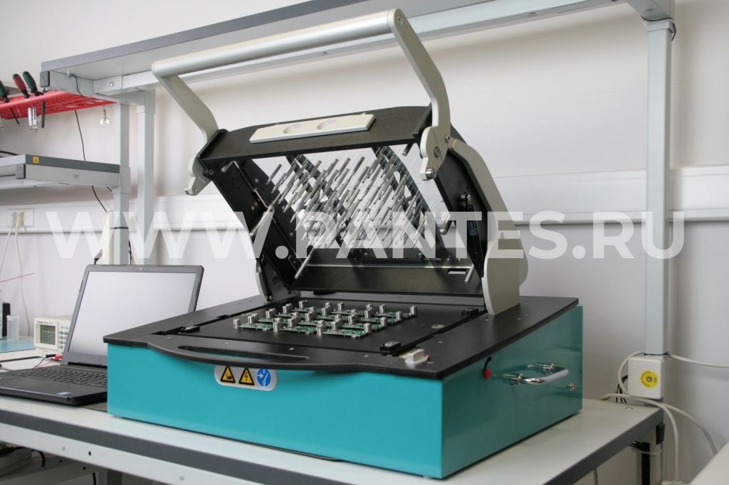 Оборудование тестирования ATX с подпружиненными контактами и сменным адаптером («ложе гвоздей»). Предназначено для проверки функционирования смонтированного изделия в составе заводской технологической заготовки. Данный процесс позволяет ускорить проверку на функционирование за счет групповой проверки.